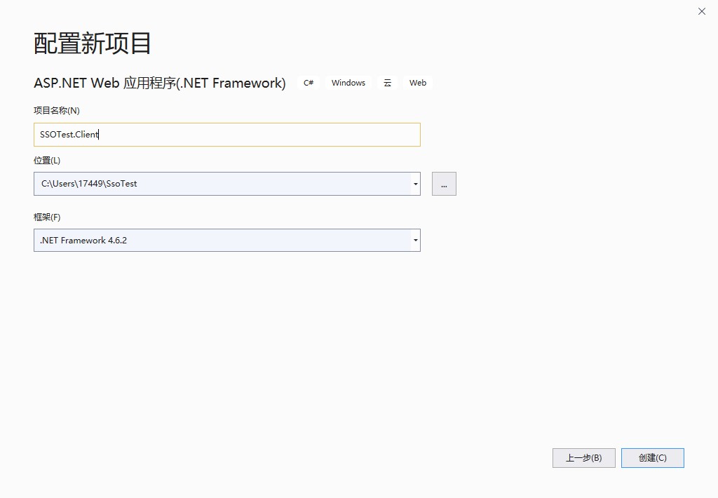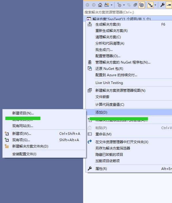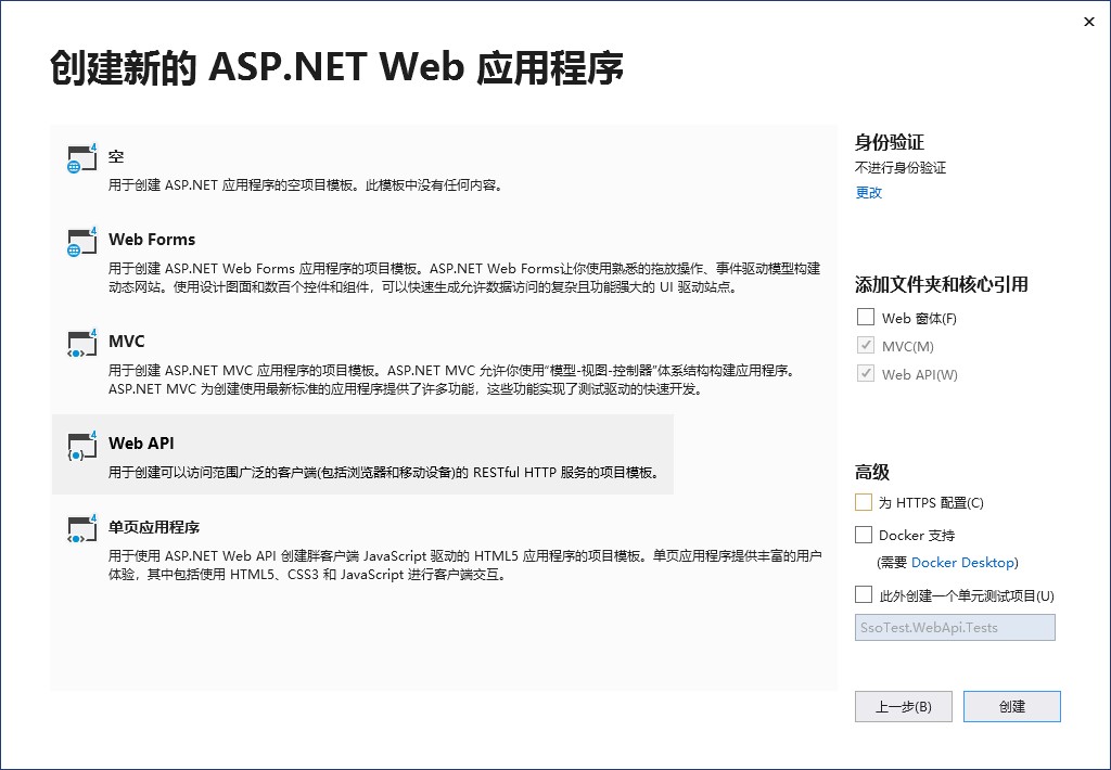 - 在解决方案上右键->添加->新建项目,创建WebApi项目,名为SSOTest.WebApi